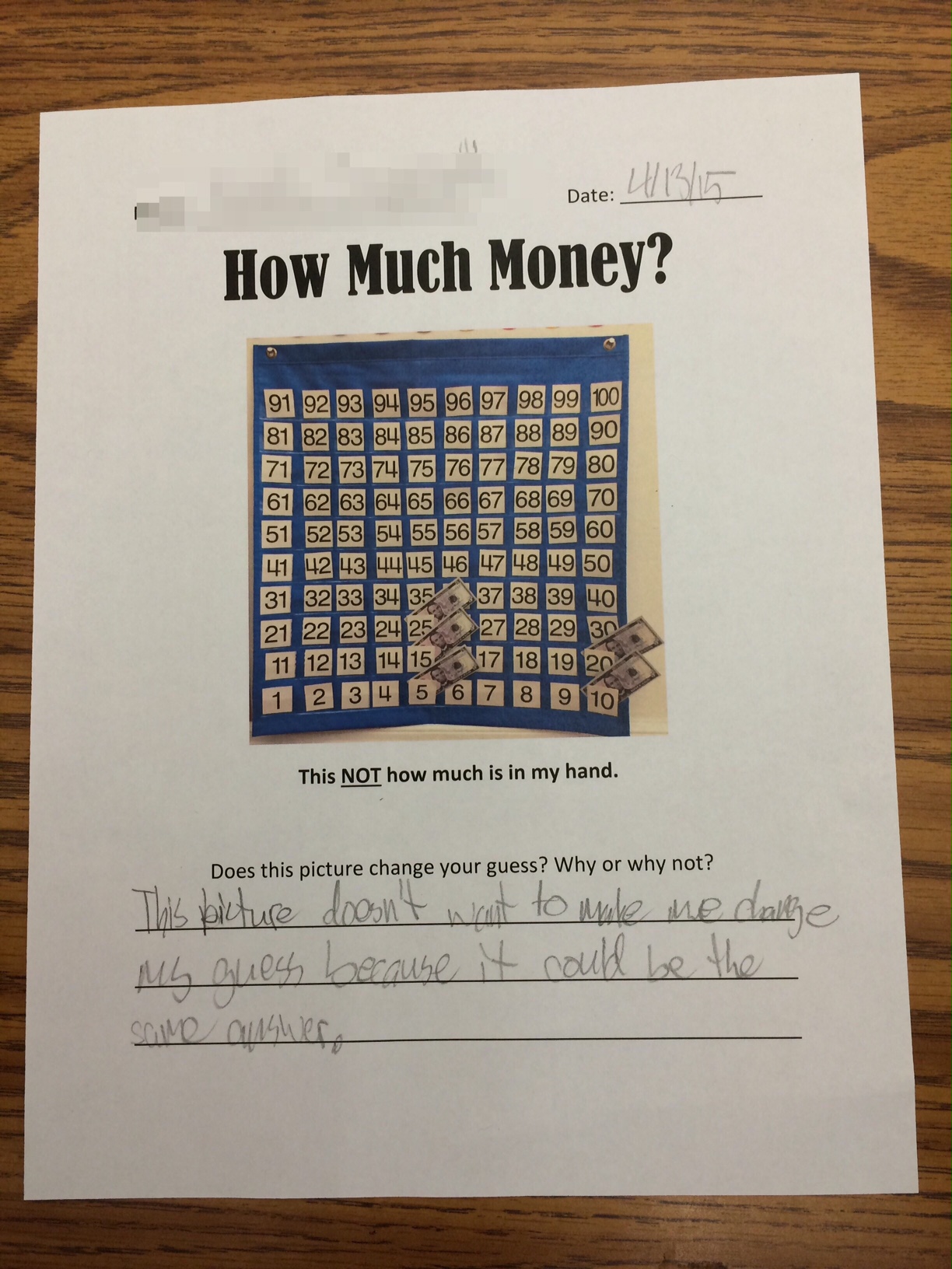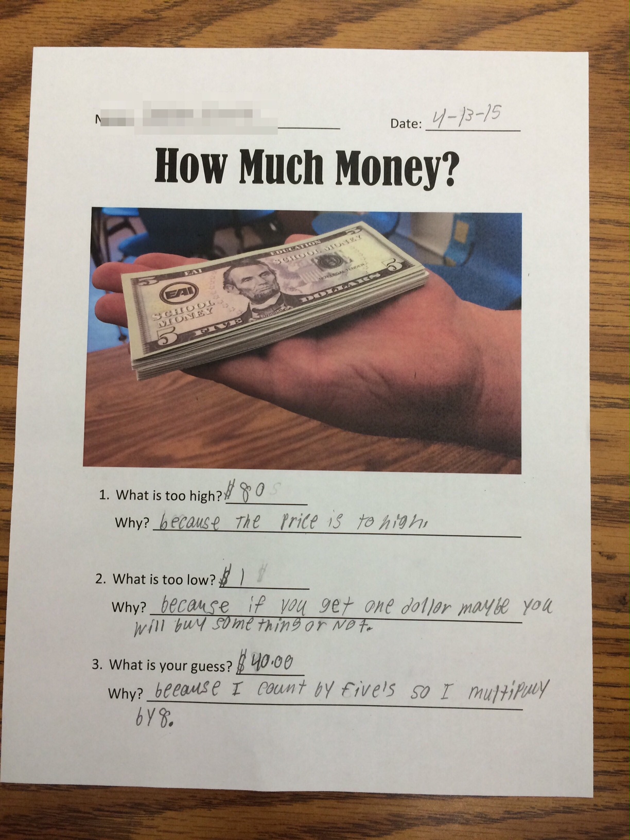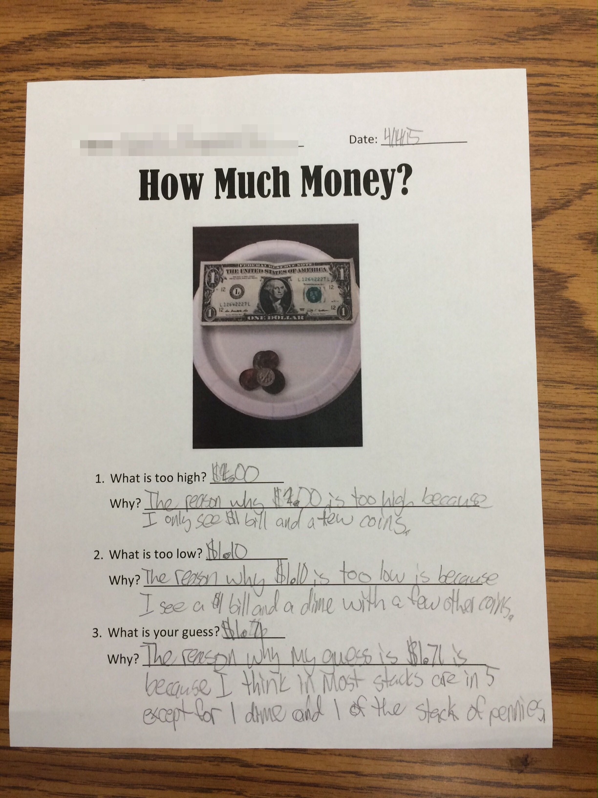 Next, inspired by Joe Schwartz’s blog post in which he created his own money estimation, we took our estimation practice a little further. I used Joe’s pictures of different combinations of coins and bills in the same format from the activity the day before.
