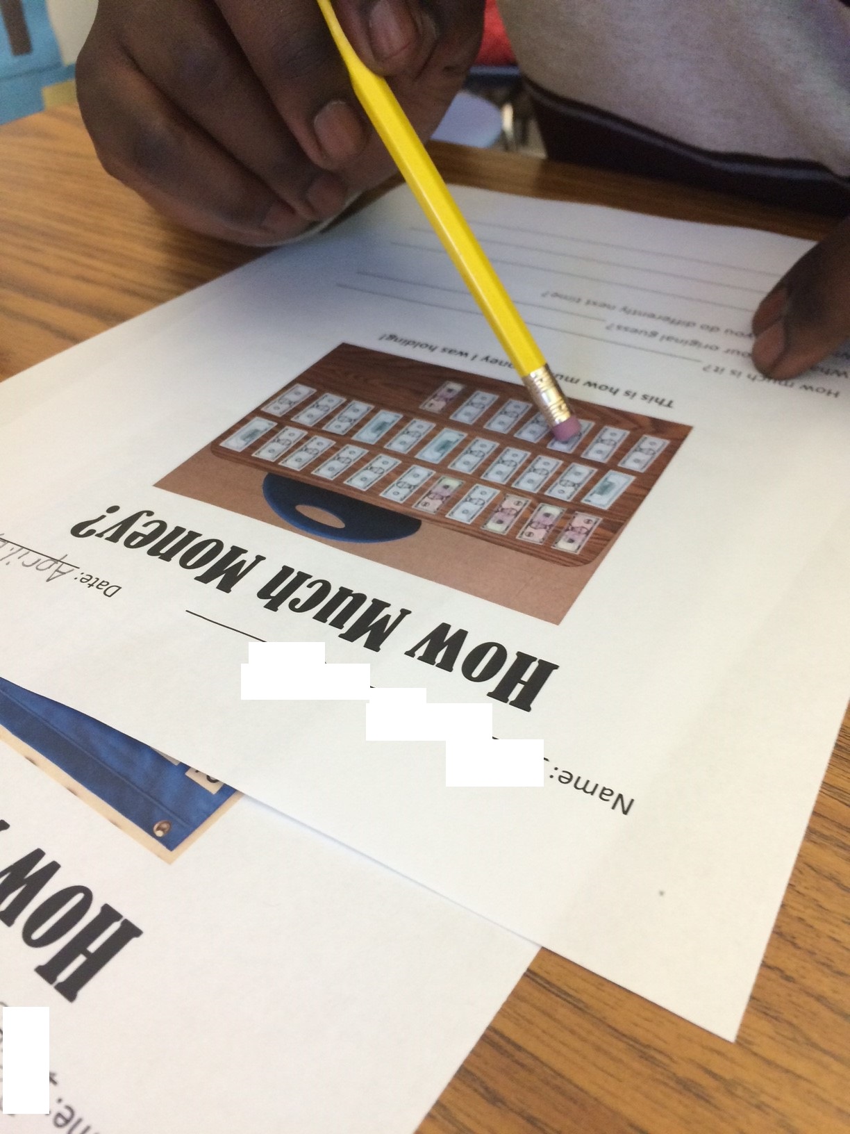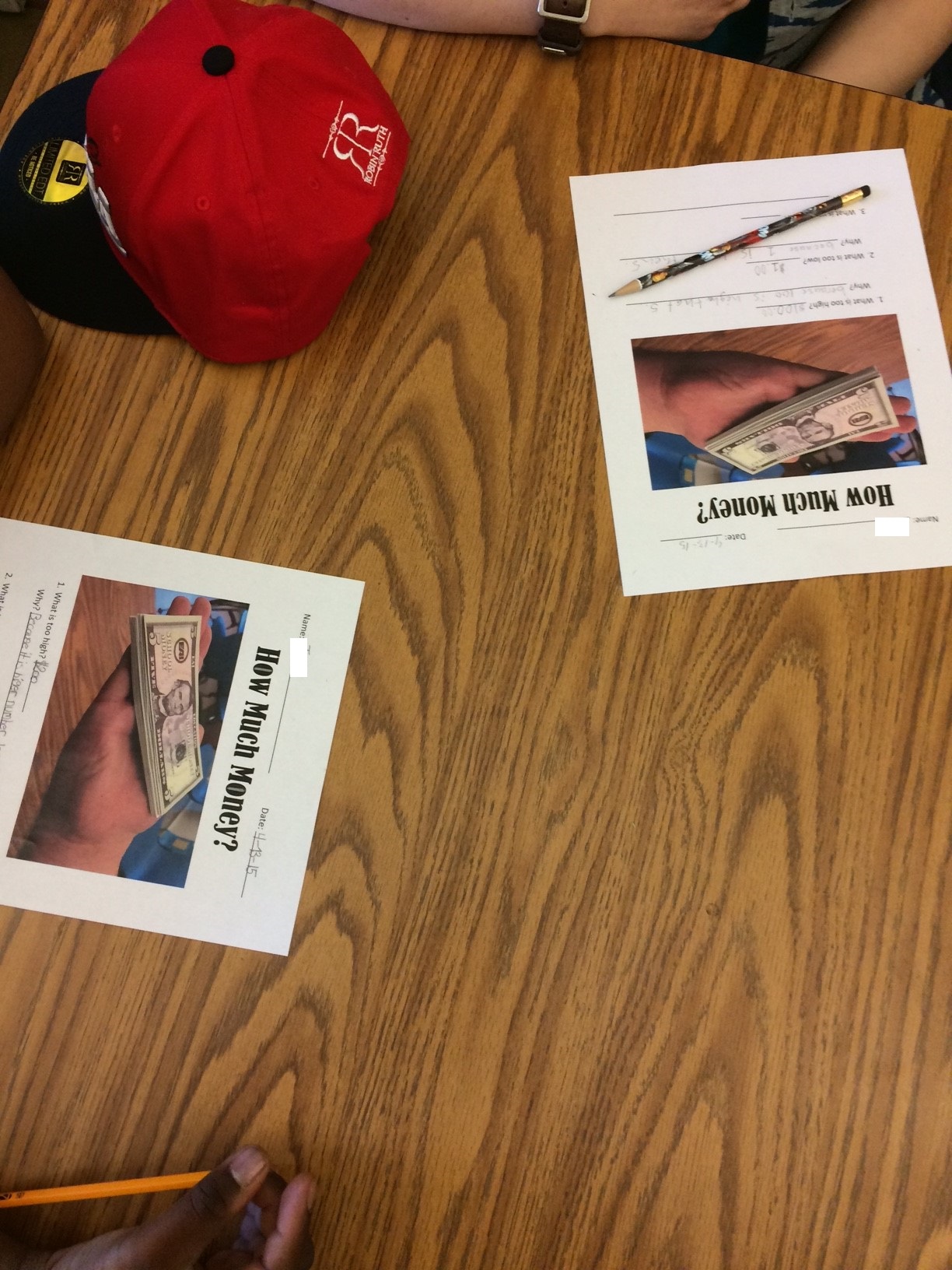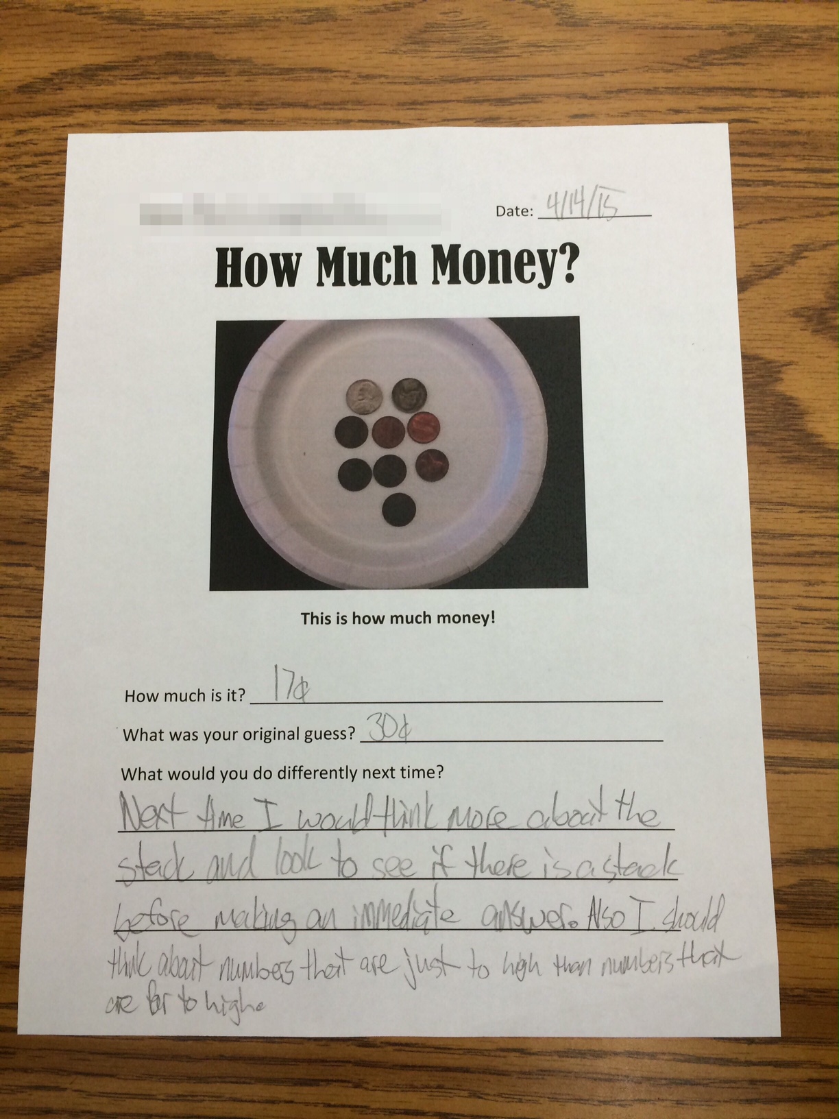 Next, inspired by Joe Schwartz’s blog post in which he created his own money estimation, we took our estimation practice a little further. I used Joe’s pictures of different combinations of coins and bills in the same format from the activity the day before.