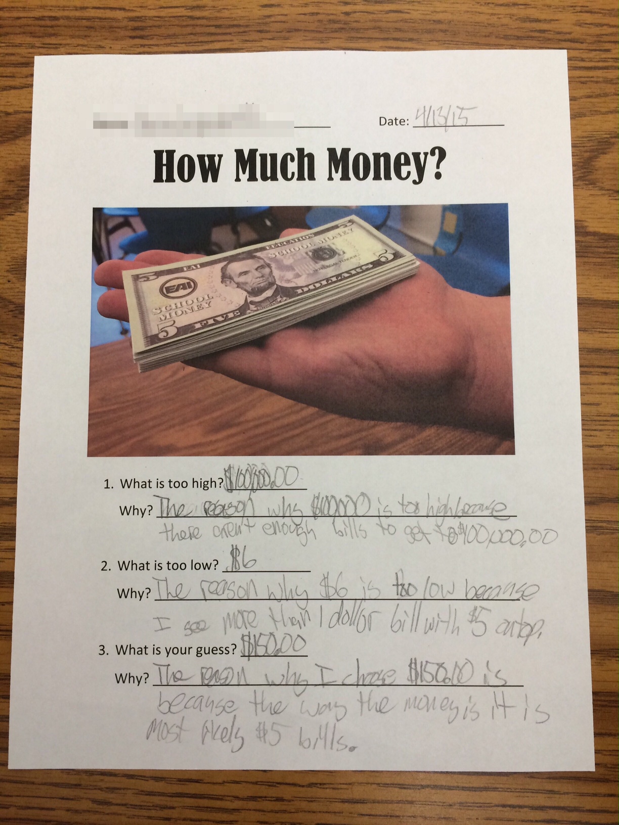 The estimates just started flying organically! My focus for the students was to use mathematical reasoning to determine sensible too high and too low guesses which could help frame our final estimates. One major change I made to the Estimation 180 framework was to have the students write their reasoning for each step of the process. I gave them a recording sheet to help organize their thinking. Deciding what was too low was a much more concrete idea for the students. They reasoned that anything under $5 was too low because they knew it was at least $5 based on seeing the top bill. The too high guesses had a much larger range and ended up being less helpful.