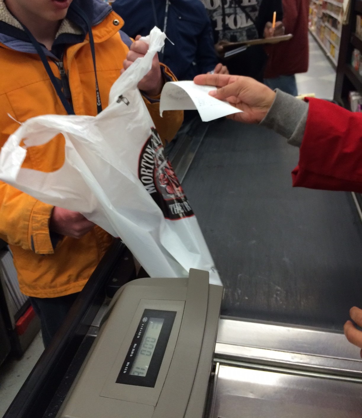 One key strategy we use is called “rounding up to the next dollar.”  We do this for two reasons.  The first is that if you round up to the next dollar for every price, you’ll always have enough money once you get to the register.  The second, and most important reason, is that it limits the likelihood that a student will get ripped off.  If a student rounds $7.19 up to $8.00 and gives only $8.00 at the cash register, then if they are missing a penny or dime in the change it is less of a problem than if they gave a $20.00 bill and are missing a $10.00 bill in their change.  We also don’t ask the students to count their change, because we see it as another opportunity for the students to use the estimation skills developed earlier in the unit.