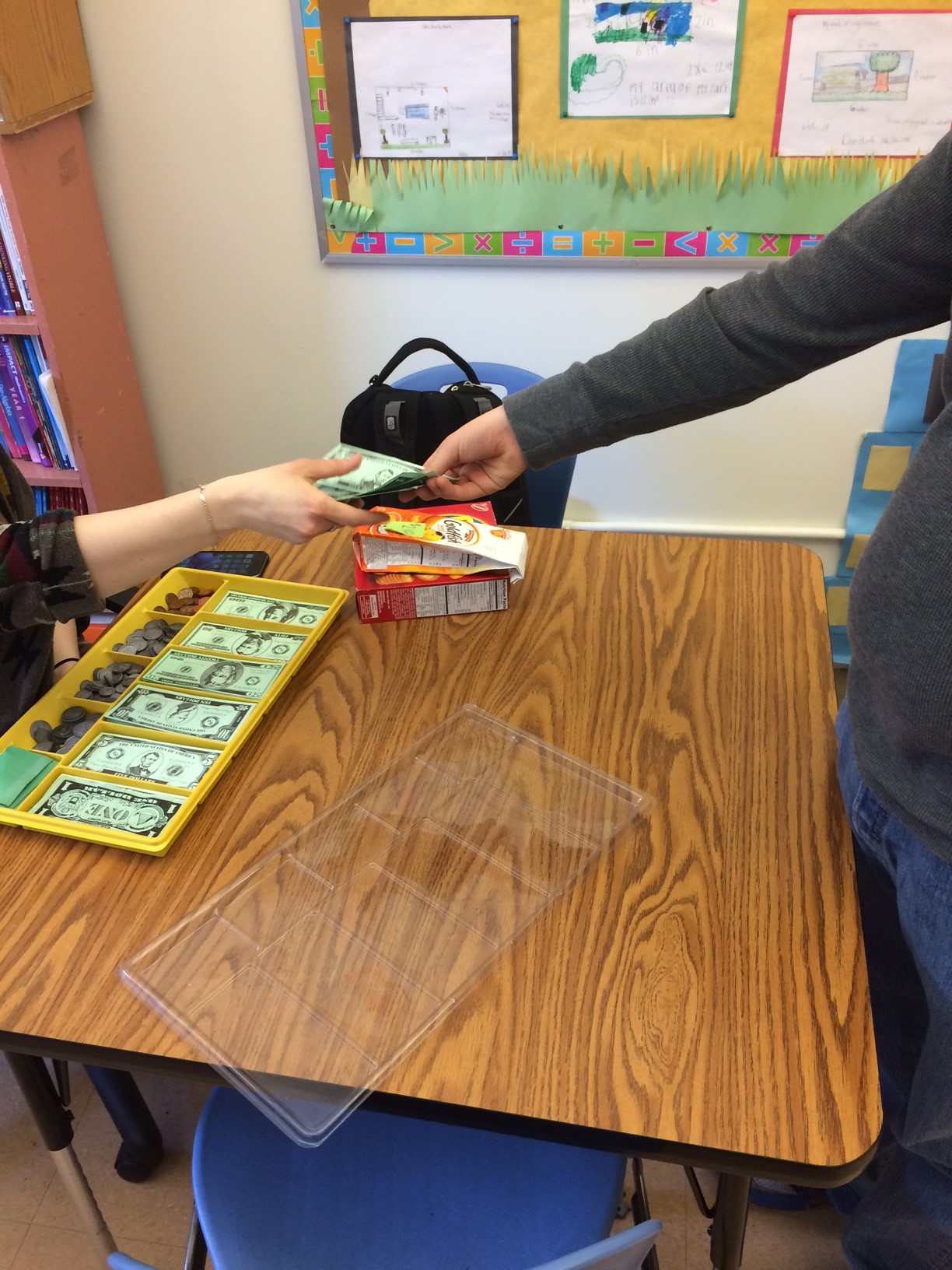 The goal of our shopping curriculum is for students to be able to independently make a purchase at a local store using cash.  The reason we focus on cash in math class is that the mathematical thinking is more visible when using cash as opposed to a debit or credit card.