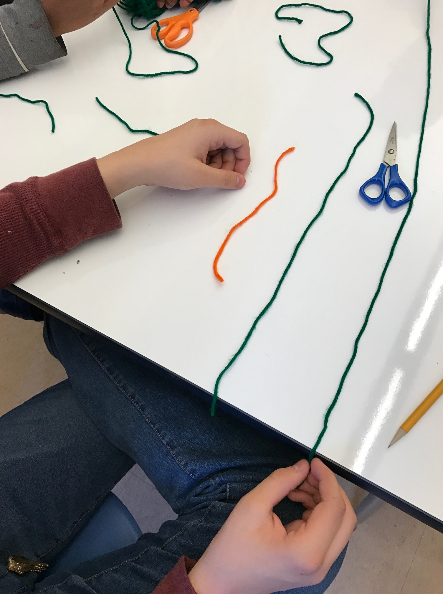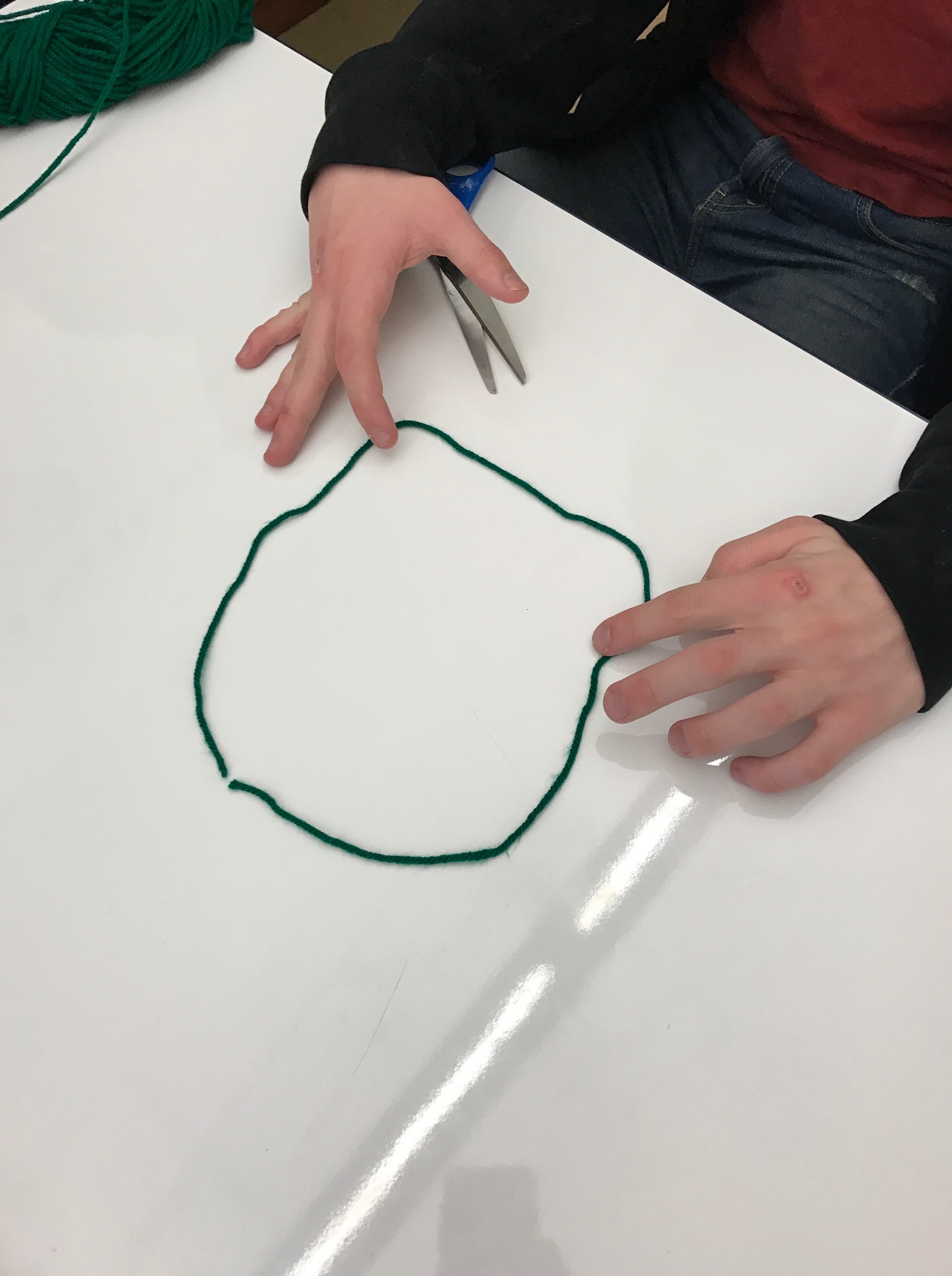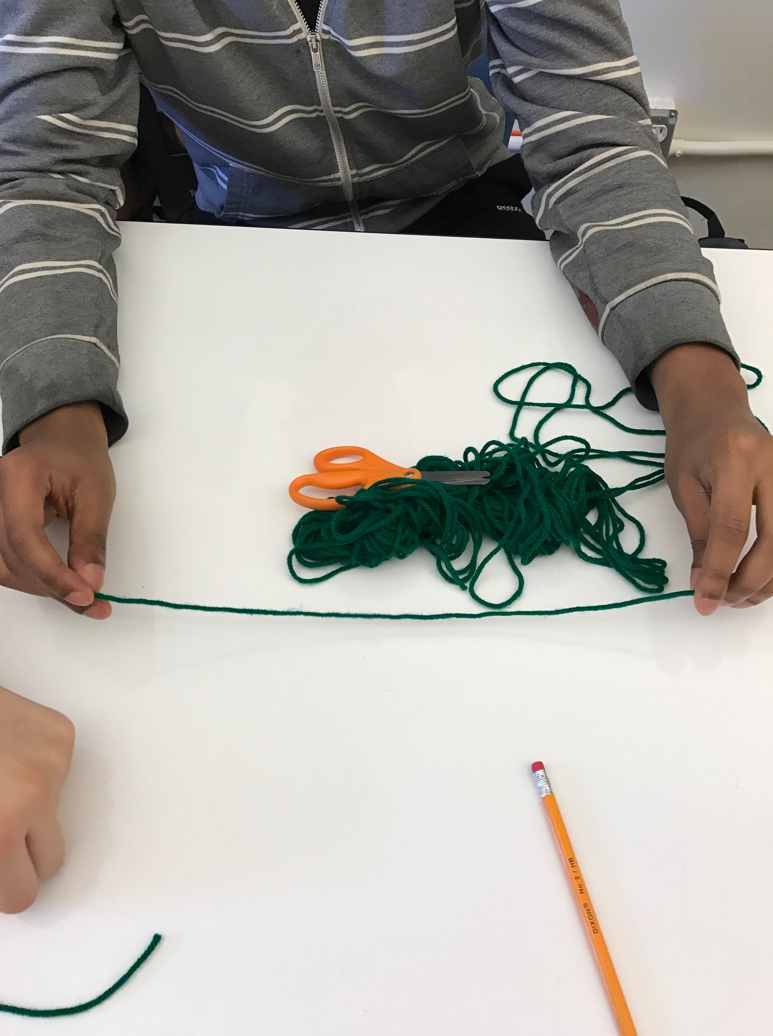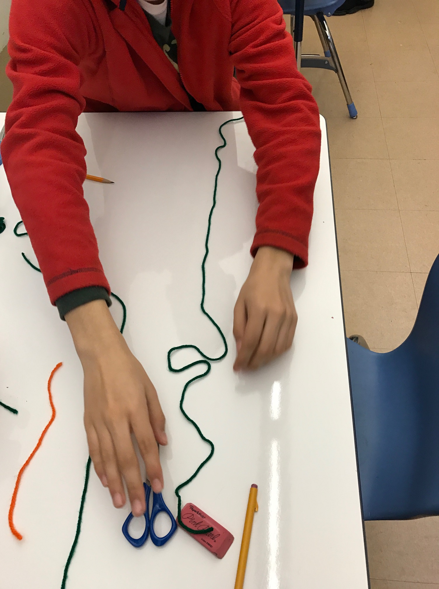 Taking inspiration from Christopher Danielson, I pre-cut some 9 inch strings that represented the diameter of our pie. The task was to work as a group to use the diameter string and observational skills to cut another string that showed each student’s estimate of the circumference of our pie. Some estimates were initially too small, some were initially too big, but eventually most students made reasonable estimates.